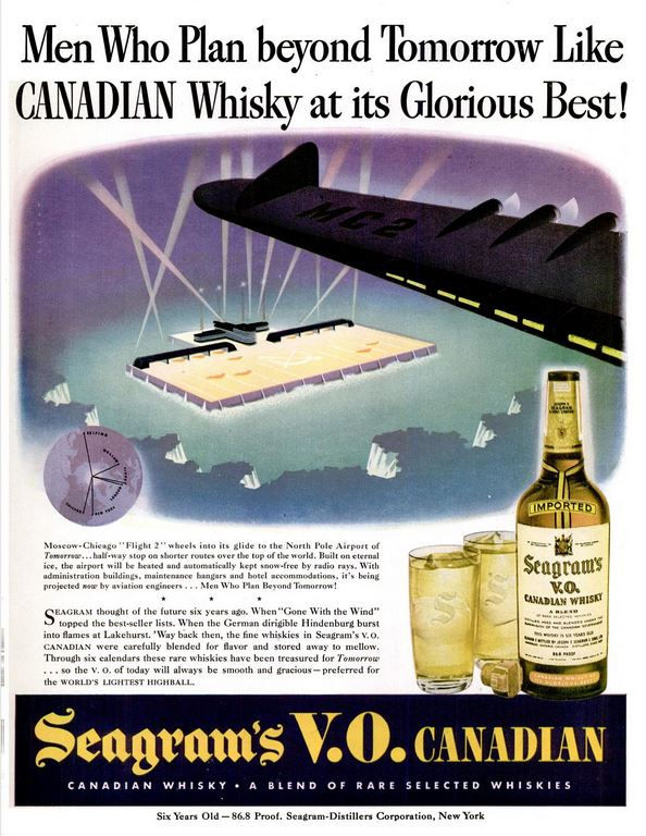 The first ad appeared in July 1942. The headline was the clunky "Men Who Think of Tomorrow Appreciate Seagram's Foresight!" The futuristic detail soared above the page: an illustration of a sleek flying wing flying over clouds.
